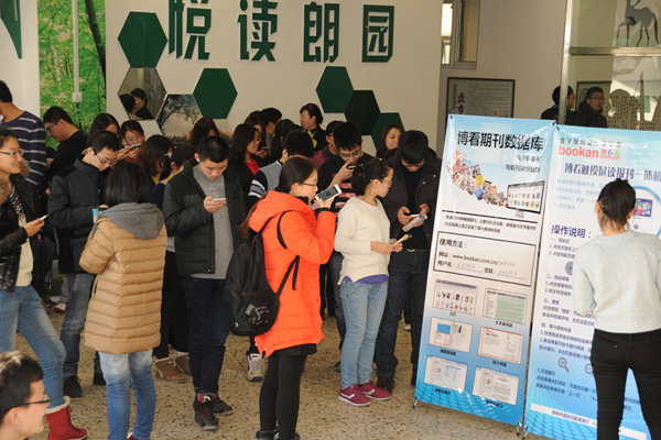 11月26日上午9点,博看期刊数据库“云阅读”现场体验活动在图书馆B5楼新技术体验区举行。我校师生近千人参加了本次活动,现场体验了博看数据库3000多种畅销报刊带来的全新移动式阅读乐趣。图书馆馆长邹红菲、书记李学益、副馆长张静和王玉波及武汉鼎森电子科技有限公司相关人员出席了体验活动。