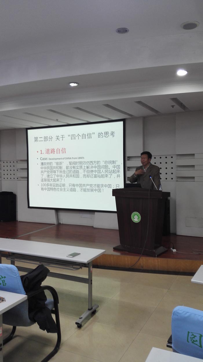 王立海馆长围绕“坚持‘四个自信’砥砺前行,实现中华民族伟大复兴”这一主题,结合中国共产党发展历程及中国特色社会主义建设的伟大历史成就,全面阐述了“四个自信”的历史由来,深刻解析了“四个自信”的基本内涵,强调坚持“四个自信”重要的现实意义。