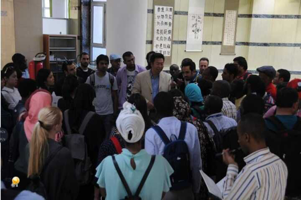 在图书馆A栋六楼大厅,馆长王立海用英语向留学生们做了自我介绍,以幽默的语言对留学生们表示热烈欢迎,并简要介绍了图书馆的情况。