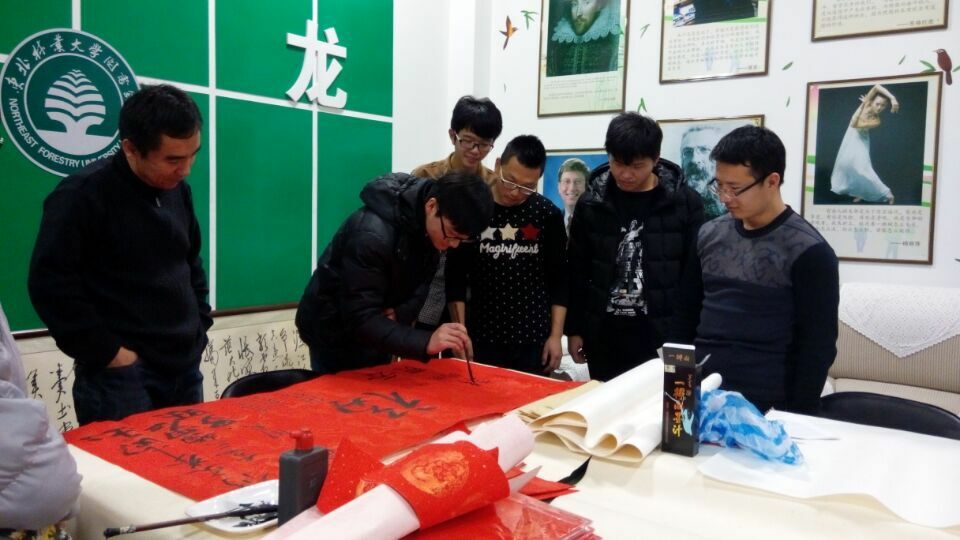活动开始,修老师首先对书画协会成立六年来的发展历程进行了简要回顾。他说:在2016年元旦即将到来之际,恰逢东北林业大学书画协会成立六周年,为辞旧迎新、纪念书画协会成立六周年,图书馆业务推广部和书画协会策划了本期读者沙龙活动,希望通过活动为书画爱好者们搭建一个交流与学习的平台,让读者们感受到中国传统民俗春联艺术的内涵和书画艺术的魅力。接着,他简要介绍了有关春联和福字的民俗知识,并邀请参加活动的读者进行了现场书画创作。书画爱好者们尽情挥毫,大胆创作,现场创作了一幅幅新颖别致的佳作,这些作品为图书馆近期举办的“图书馆迎新春暨东林书画协会成立六周年汇报展”再添新意,成为展览的一部分。活动最后,修老师带领大家进行了书画知识有奖问答,并向参与活动的同学赠送了春联。在愉悦、欢快的气氛中,第64期读者沙龙活动圆满结束。