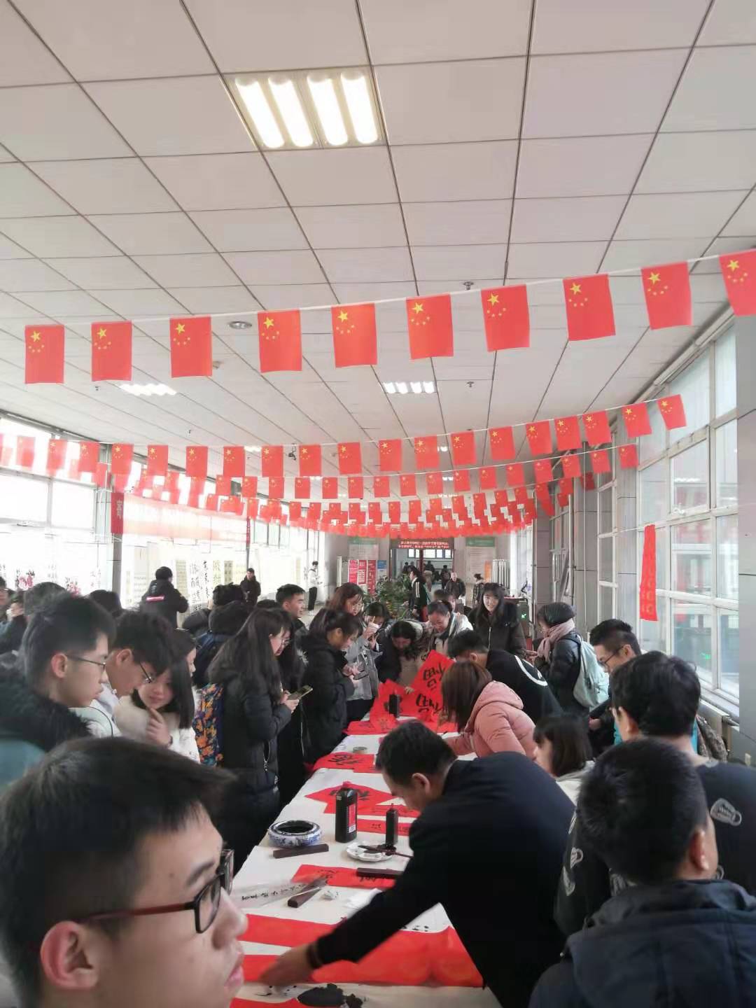 本次活动准备工作充分。图书馆第一党支部、图书管理部和校书画协会成员提前设计制作条幅,购买对联、福字、宣纸以及墨汁等用品和工具,书写条幅对联和书法作品300余件,并在活动前一天布置完成。活动现场参与度极高。馆员、读者驻足赏析一幅幅书画作品,从一笔一画中感受深情与韵味,体会中国传统文化的魅力与精髓。现场手写赠春联,是传承我国传统文化的有效形式,读者排起长队,等候获赠春联,提前感受佳节的喜庆与祥和。