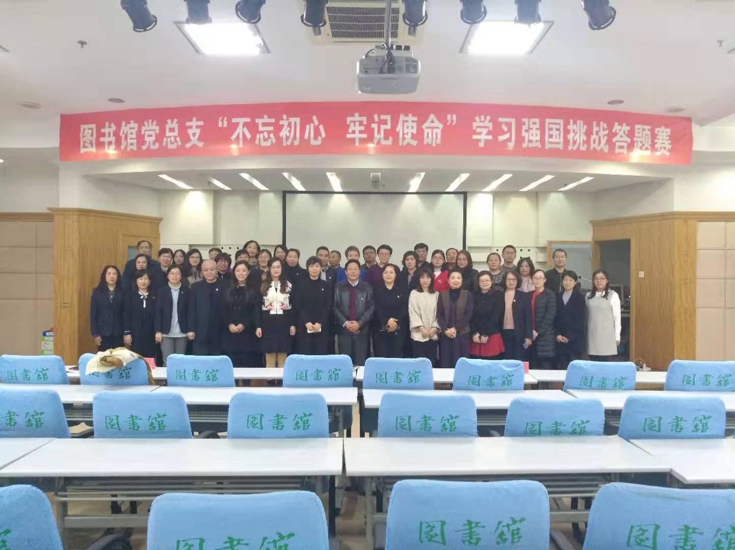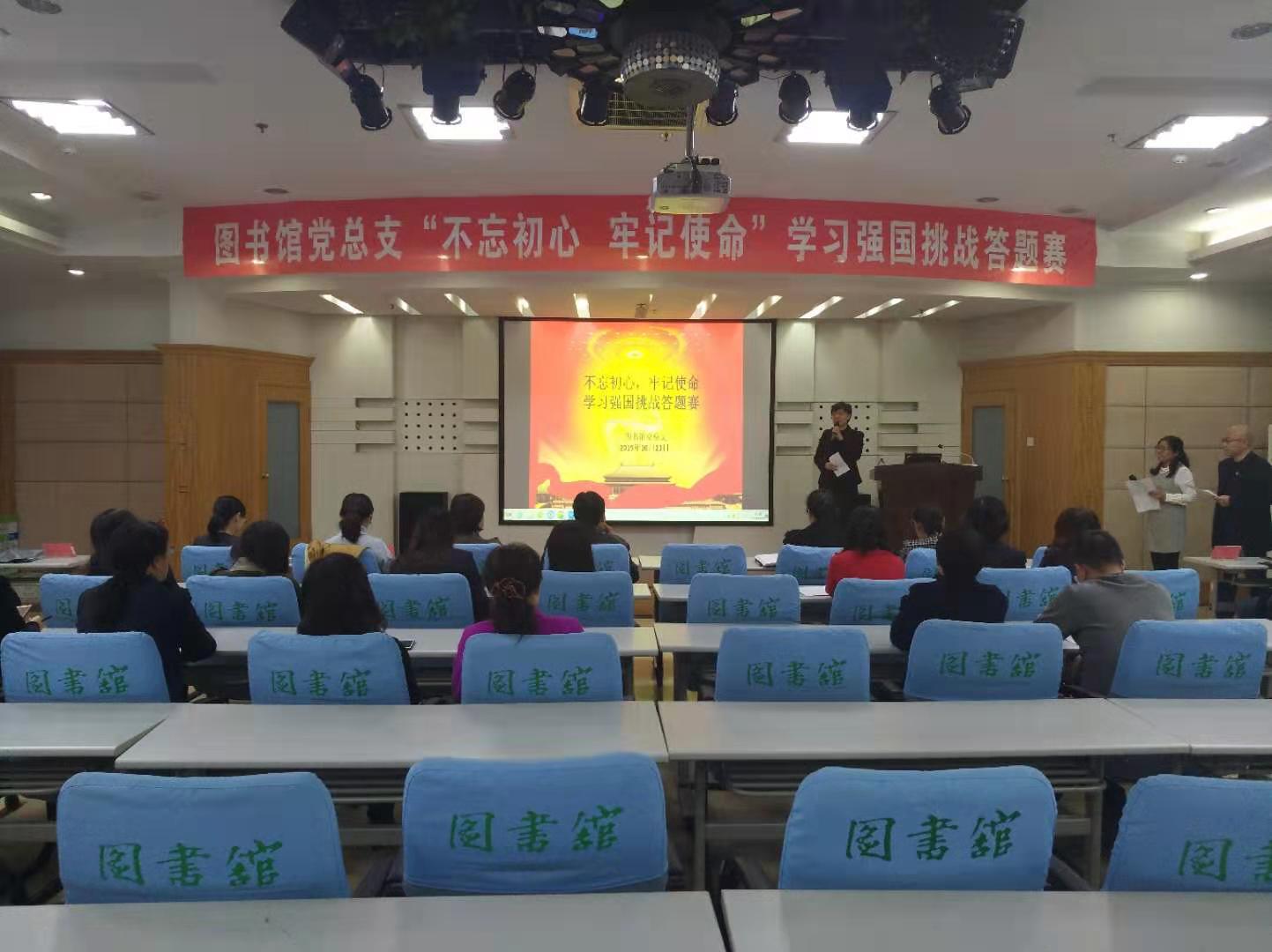 为了创新学习形式,彰显学习特色,实现学习强国线上学习和线下学习相结合,个人自学和集体共学相结合,10月23日下午,图书馆党总支在多功能厅举行“不忘初心、牢记使命”学习强国现场挑战答题赛。