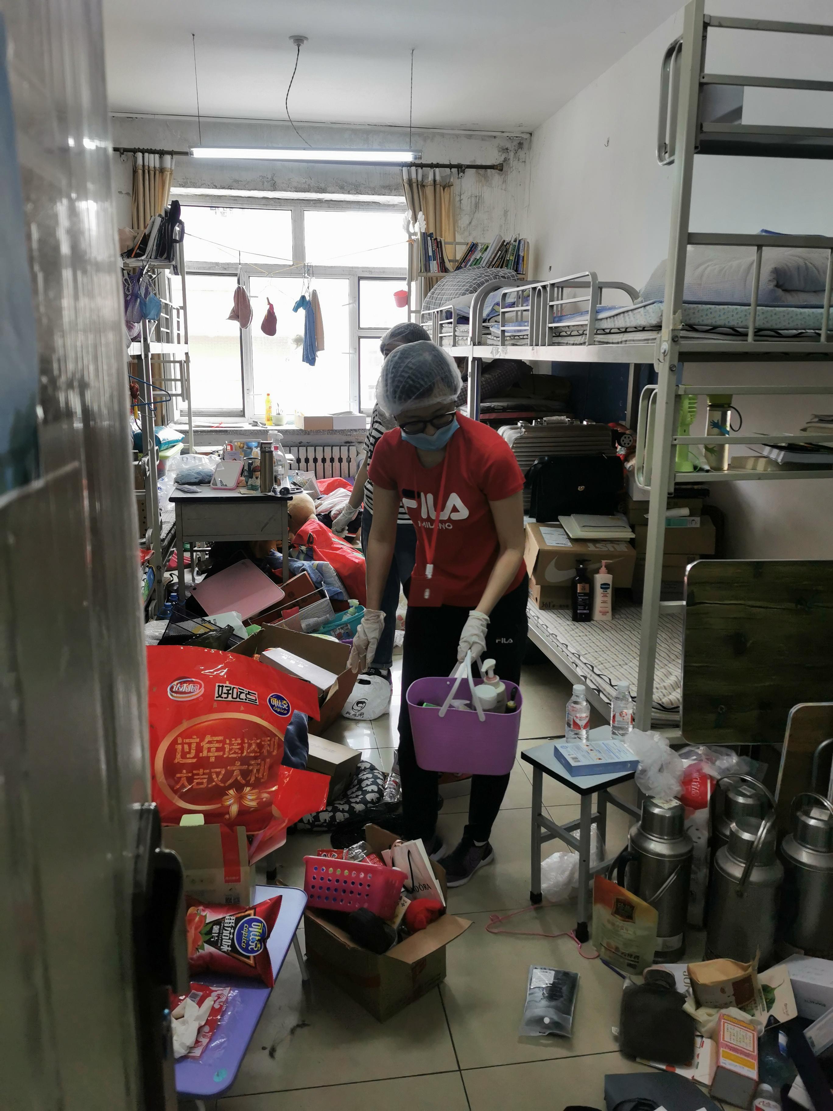 书包柜清理干净之后,女老师们两人一组来到了工程技术学院的女生寝室,开始艰巨的打包整理工作。
