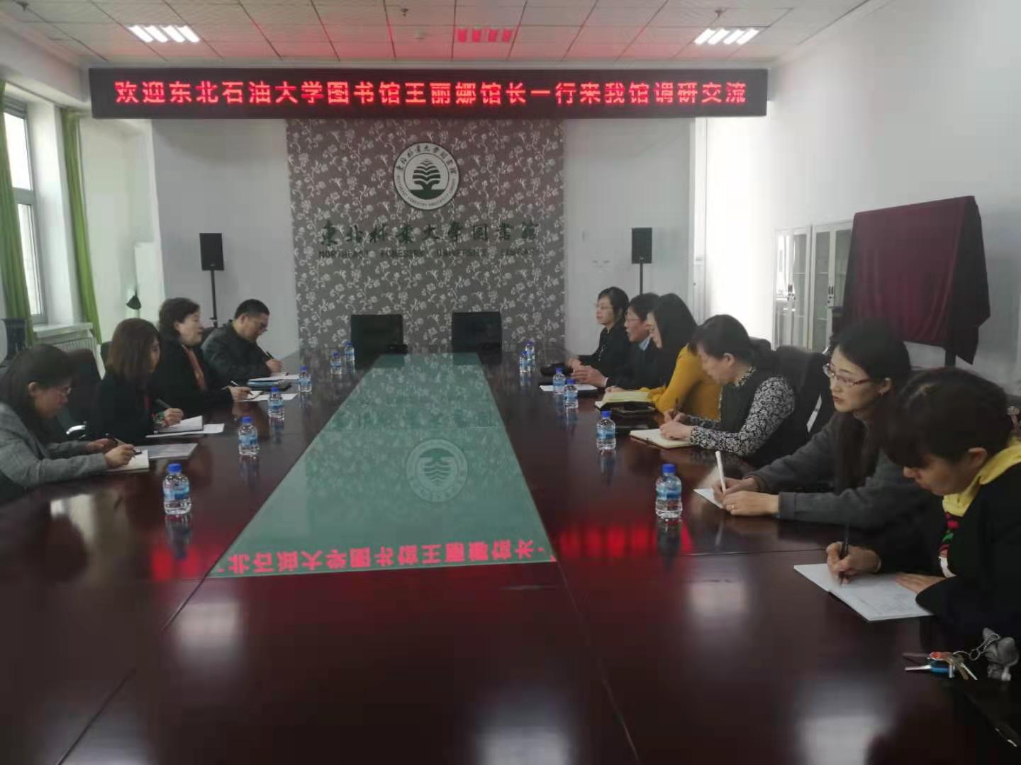 王丽娜馆长交流了东北石油大学图书馆知识产权工作方面现状,高度评价我馆知识产权信息服务工作,希望通过此次调研加快东北石油大学图书馆知识产权信息服务中心建设。
