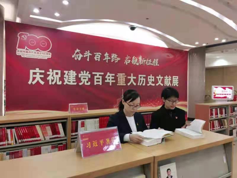 “奋斗百年路 启航新征程”庆祝建党百年重大历史文献展分为两个板块:纸质文献展示区和电子资源展示区。纸质展区包含七个主题:习近平著作、中国精神、党史文献、新中国史文献、改革开放史文献、社会主义发展史文献以及文学畅销图书。电子资源展示区展示了歌德电子书借阅机和博看阅报机上的建党百年重大历史文献资源。一部部党史文献向馆员展现了中国共产党波澜壮阔、跌宕起伏的历史画卷;一本本党史书籍让师生领略了红船精神、井冈山精神、长征精神、抗美援朝精神、大庆精神、塞罕坝精神等所铸就的共产党人坚定的理想信念。