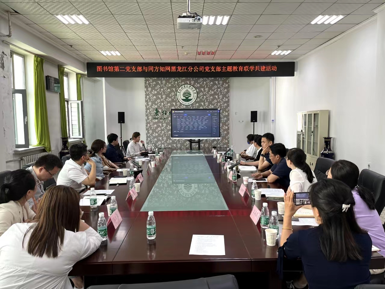 为全面贯彻习近平新时代中国特色社会主义思想,扎实开展主题教育,6月14日,图书馆第二党支部与同方知网黑龙江分公司党支部联合举办“党建引领聚合力,‘林’‘知’携手促提升”的联学共建活动。图书馆党总支书记王晓明、馆长张凤斌、副馆长刘亚丽,同方知网黑龙江分公司总经理赵景海、同方知网黑龙江分公司党支部书记、副总经理卞妍出席了此次活动。活动由图书馆第二党支部书记高珊珊主持。