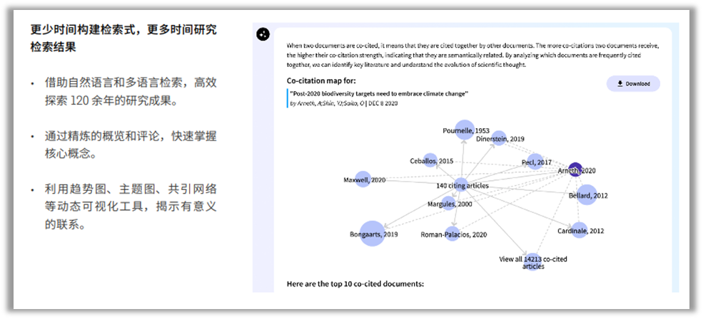 我们的研究助手不只是简单的聊天机器人,它会在您工作时同步运行,紧跟您的研究需求。智能发现功能可以让您轻松解读和探索文献资料。基于任务的指导说明以及语境化的提示可以为您提供可能的研究路径,助您高效完成复杂的研究任务。为了充分发挥生成式人工智能在应用场景中的应用优势,我们的数据科学家对学术研究领域的内容准备和检索过程进行了优化,将每一次的查询通过专有路径进行传递,并解析成可检索的术语,然后通过检索增强生成(RAG) 给出结果,以确保提取的信息仅限于 Web of Science 核心合集中值得信赖的内容。在生成的应答中,每个语句都有相应的文献来源,用户可以对照相关研究来验证答案。