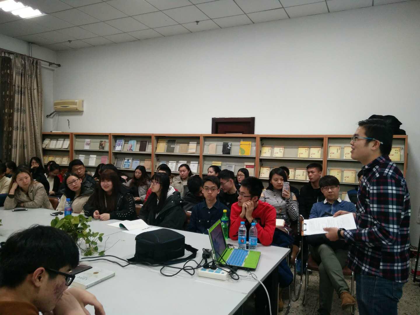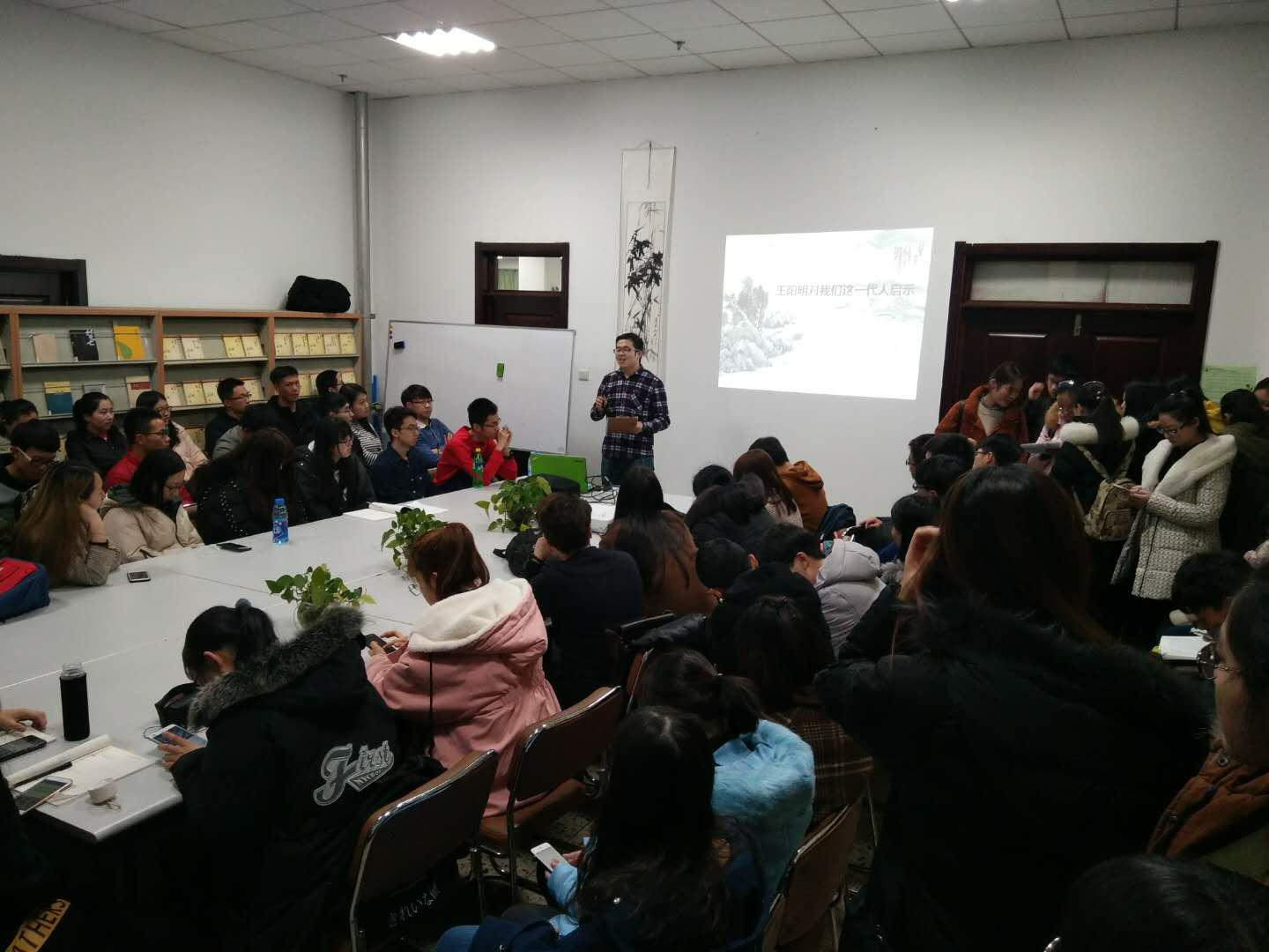 最后,分享者以一名大四学长的身份,为前来参与活动的学弟学妹们送上了忠告:放下手机,多去看看有内涵、值得阅读的书籍,多和身边的人用语言面对面交流,放下手机早睡早起,世界不单是由游戏、电视剧、综艺节目等构成,手机外面的世界才是真实而又精彩的世界。他用当下流行的电影《无问东西》中的一句话“爱你所爱,行你所行,听从你心,无问西东”告诉大家,这就是每个人心中的知行合一,这就是平凡人的致良知。(张晓茹)