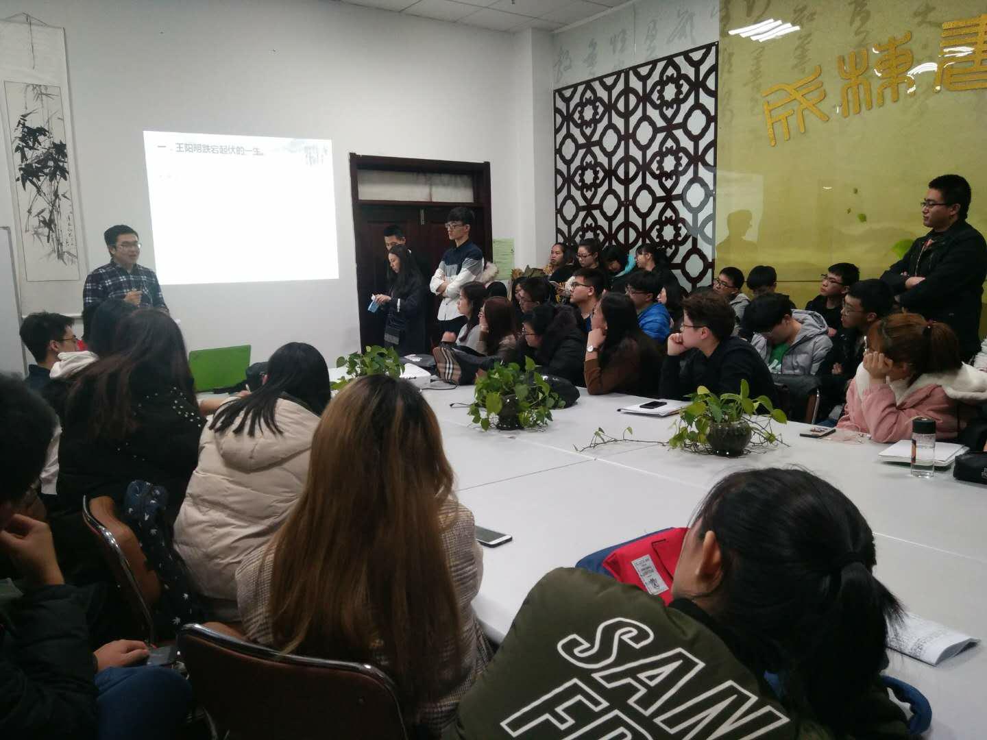 首先,分享人从王阳明不平凡的出生到“此心光明,亦复何言!”的病逝,将王阳明的一生划分了九个阶段:不平凡的出生、叛逆少年、娶妻诸氏、步入仕途、被贬悟道、赣南剿匪、平定叛乱、广西平匪和病逝归途。分享人运用许多现代流行词汇和生动幽默的“现代式比喻”,将王阳明的一生浓缩在九个板块中,期间还穿插了许多关于王阳明的小故事,使分享活动生动有趣;接着又以讲故事、举例子和打比方的方式诠释了阳明心学内容:“心即理,知行合一,致良知及阳明四句教”,并分享了他对阳明心学的理解和感悟。