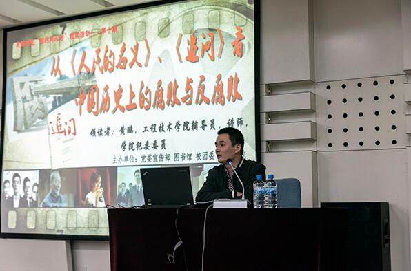 5月11日晚6时,第十期成栋书院“相约两小时”领读活动在图书馆如期举行。我校工程技术学院辅导员、讲师、学院纪委委员黄鹏作为本期的领读嘉宾,以近日热播的反腐题材电视剧《人民的名义》开题,带领大家领读两部反腐题材的文学作品《人民的名义》和《追问》。党委宣传部、图书馆、校团委的主要负责同志和百余名师生参加了此次活动。报告厅内座无虚席,甚至还有学生席地而坐,聆听领读者的解读。