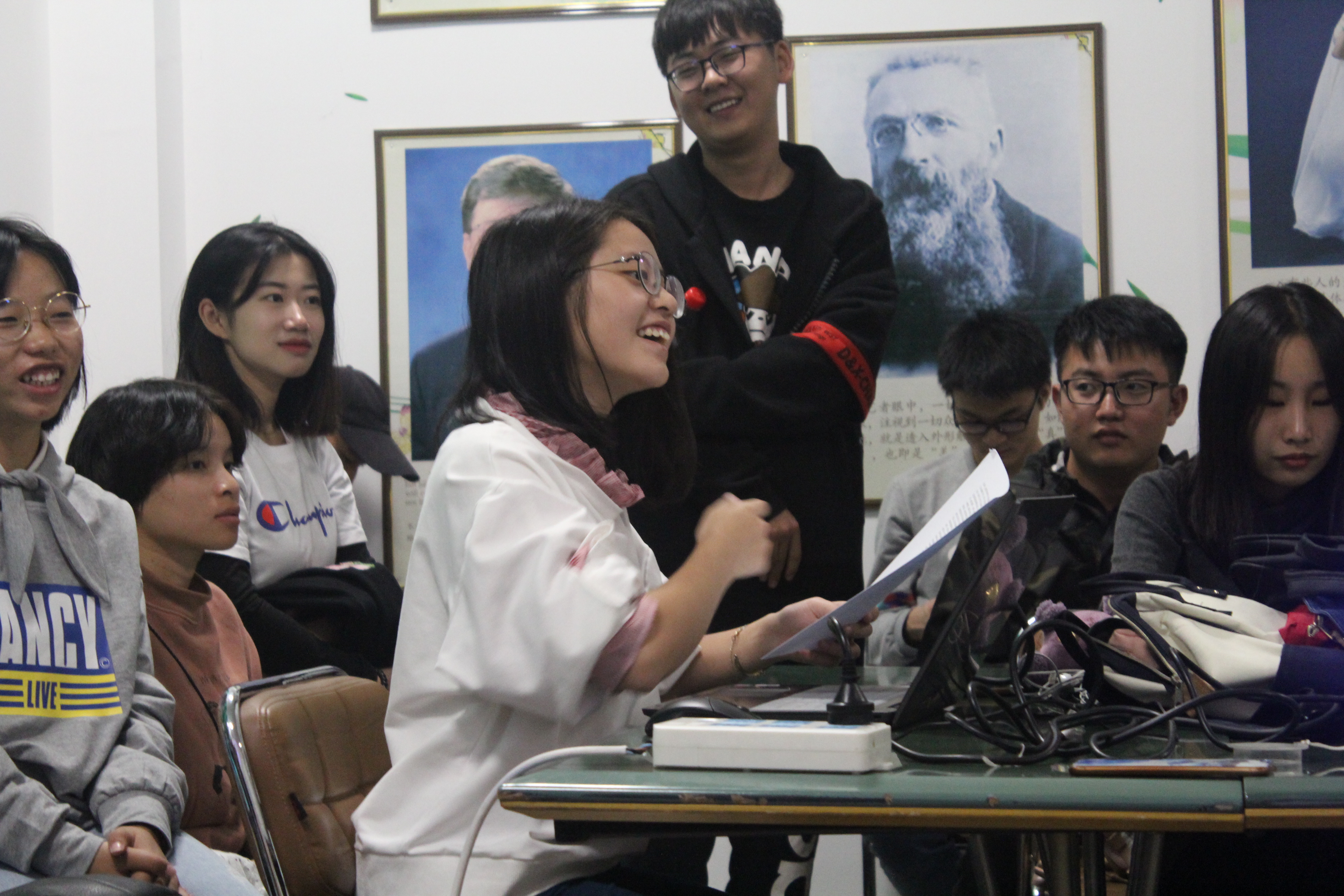 活动中,邓懿先向大家介绍了五月天这个摇滚乐团的一些成长情况:乐队前身为“So Band”乐团,1997年正式改名为“五月天”。接着她直接切入主题,为在场的同学们分享了自己对“五月天”乐队歌曲的见解。邓懿说,“五月天”乐队走到今天靠的并非是他们的颜值,而是他们优美的旋律、歌声以及别出心裁的填词。如《咸鱼》中的“咸鱼也要有梦……我将会证明用我的一生”,歌词形象生动地表达了这样的道理:平凡的生命也不该放弃对梦想的执着,坚守理想总会迎来美梦成真的时刻。真挚的情感和简洁平实的词语使得五月天的歌词别具一格,直击心灵。主讲人还与大家研究了五月天的歌词的另一些特点,歌词中叠词、修饰、故事、留白等很是常见,并且行文格式自由,雅俗兼得,十分符合大众的审美。通过她的分享,在场同学又一次鉴赏了五月天的歌词。
