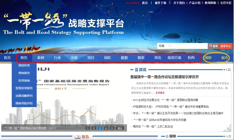 读者通过http://ydyl.drcnet.com.cn/进入“‘一带一路’战略支撑平台”数据库,可以通过两种方式在平台中找到有关一带一路“理想中的文献或数据”。 1、浏览首页导航条,根据导航条中的栏目查找需要的内容。