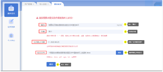 登录检测页面,输入篇名、作者,选择比对日期,上传论文,点击“提交”进行检测。