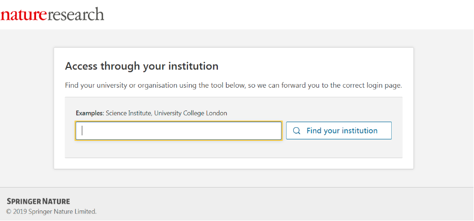 3、 在“Access through your institution”内容下的选择框中搜索“学校英文名称”,并点击“Find your institution”,在结果列表中选择“学校英文名称”.